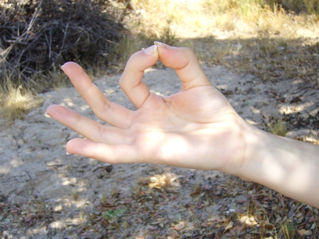 En “Sa”, toca el pulgar con el índice ( Gyan Mudra); en “Ta” toca el pulgar con el dedo corazón (Shuni Mudra) ; en “Na”, toca el pulgar con el dedo anular (Surya Mudra); y en “Ma”, toca el pulgar con el meñique (Buddhi Mudra). Aplica una presión cada vez que los dedos se toquen. Continúa moviendo los dedos durante el ejercicio, incluso durante la parte silenciosa.