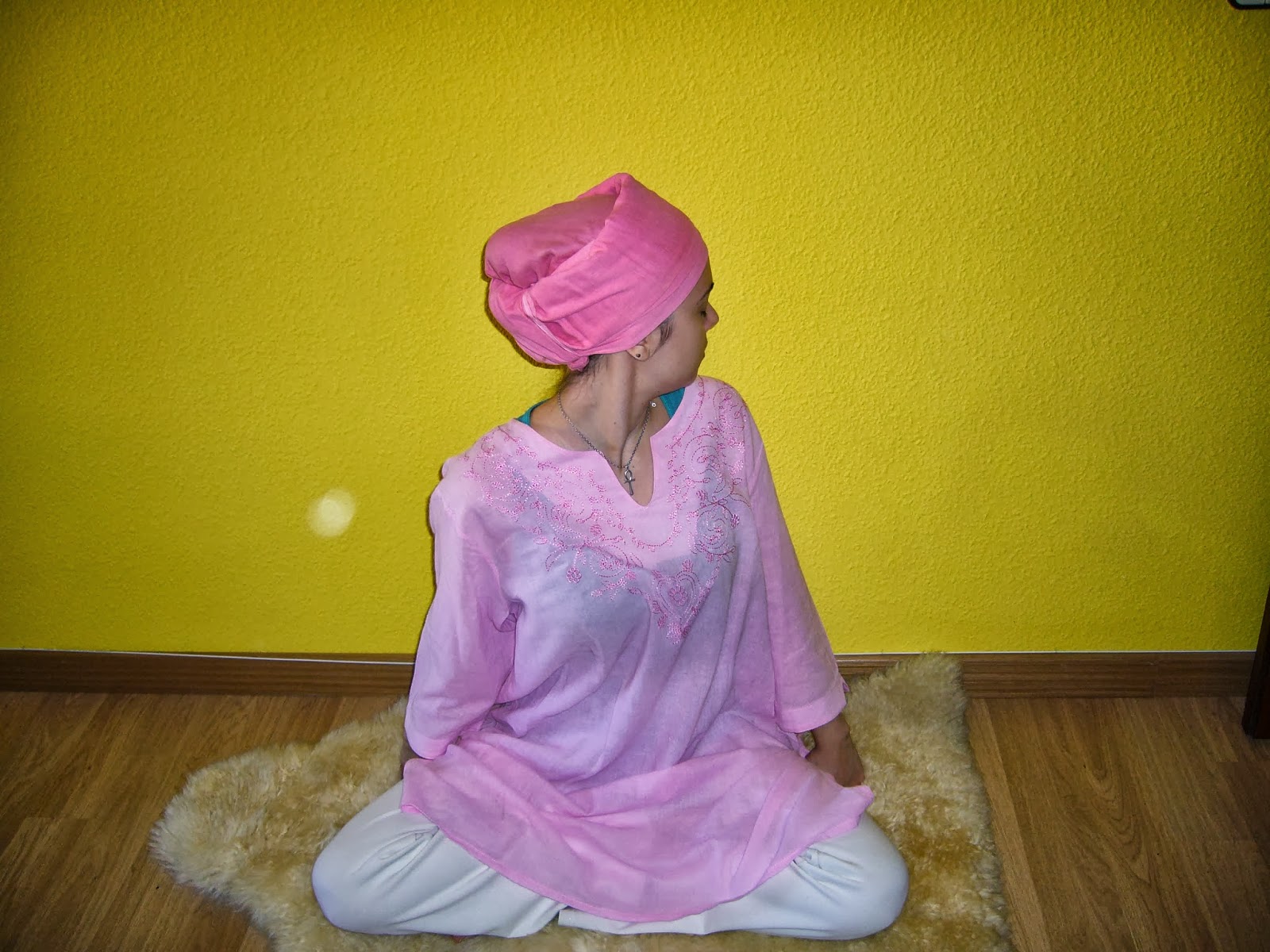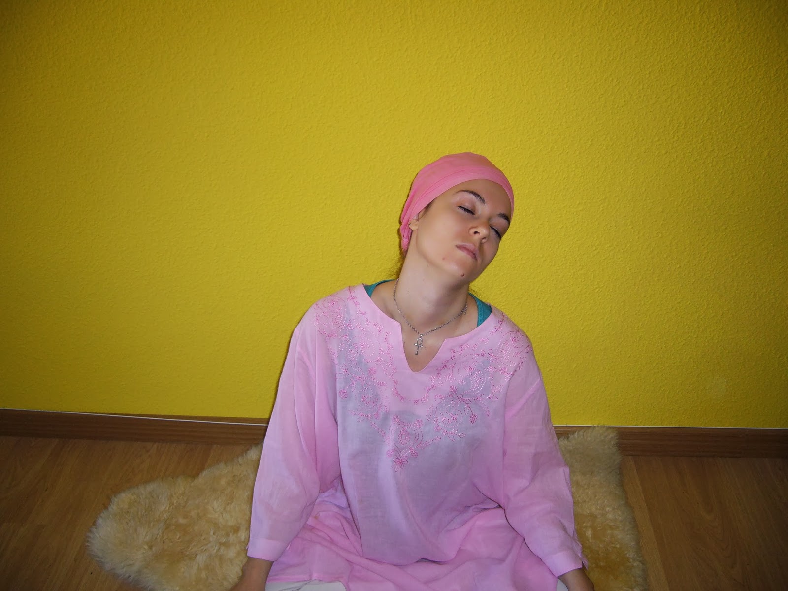 4) En postura fácil con la espalda recta, pon los brazos a los lados, apoyando los puños sobre el suelo. Empieza a girar el cuerpo de lado a lado sin mover la cabeza. Inhala a la izquierda, exhala a la derecha. Después de 3 minutos comienza a cantar «Jom Dom Jar Jar». Cada sílaba corresponde a un giro. Continúa cantando con ritmo durante 30 segundos más. Este ejercicio rompe los depósitos de calcio y ajusta la caja torácica al igual que las vértebras inferiores del cuello.