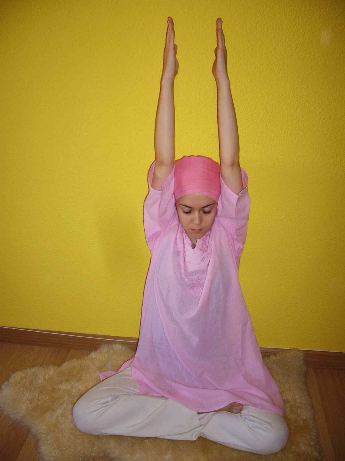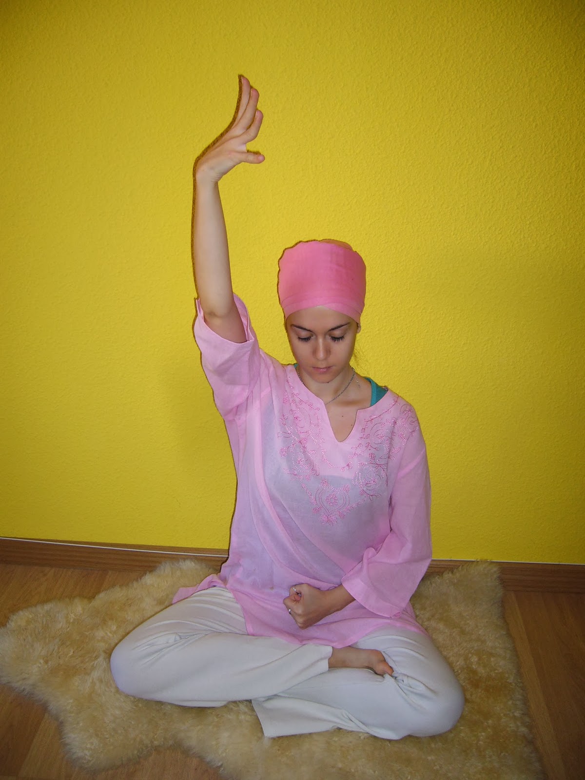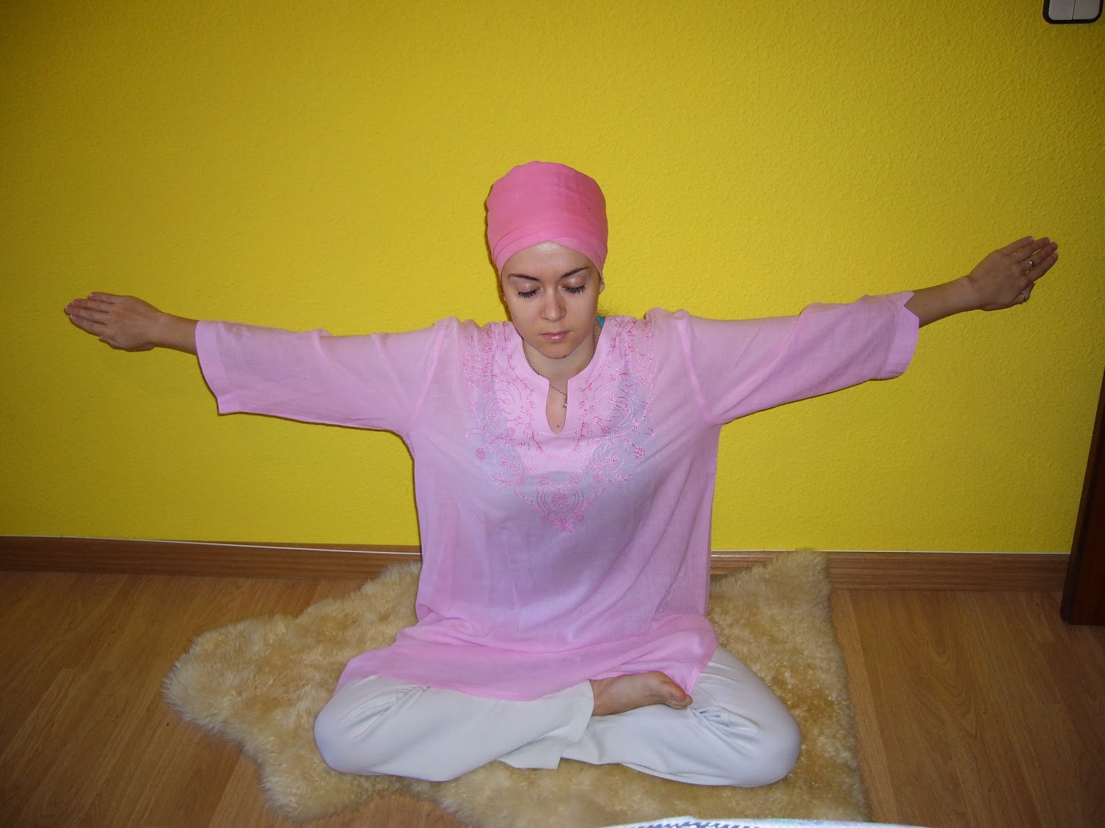 1) Siéntate en postura fácil. Di «Saa» y estira los brazos hacia el frente con las palmas viendo hacia fuera (a través de todo el ejercicio las palmas quedarán viendo hacia fuera). Di «Taa» y jala los brazos desde esta posición hacia los lados. Di «Naa», jalando los brazos hacia atrás, extendiéndolos lo más hacia atrás posible y sin doblarlos. Di «Maa» y regresa los brazos a los lados. Finalmente regresa al frente. Es un ejercicio en 4 pasos con el mantra «Saa-Taa- Naa-Maa». Continúa por 3 minutos.